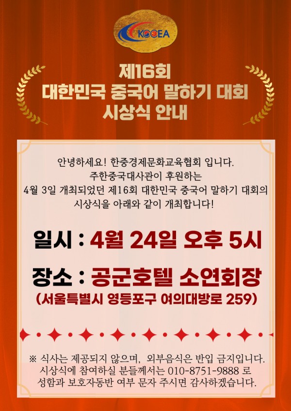 제16회 대한민국 중국어말하기대회 시상식 개최 페이지 정보 작성자 최고관리자 작성일22-04-20 06:21 조회8,419회 댓글0건 관련링크 이전글 다음글 목록 본문 안녕하십니까!제16회 대한민국 중국어말하기대회 시상식을 아래와같이 개최합니다.일자:2022년 4월 24일(일요일)시간:17시장소:대방동공군호텔 이전글 다음글 목록