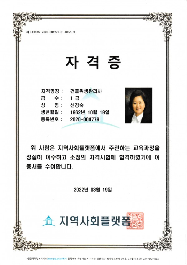 축" 건물위생관리사 자격증" 취득 페이지 정보 작성자 최고관리자 작성일22-04-07 14:27 조회8,267회 댓글0건 관련링크 이전글 다음글 목록 본문 신경숙중국어학원설립대표원장께서는건물위생관리사 자격증을 취득하였습니다. 이전글 다음글 목록