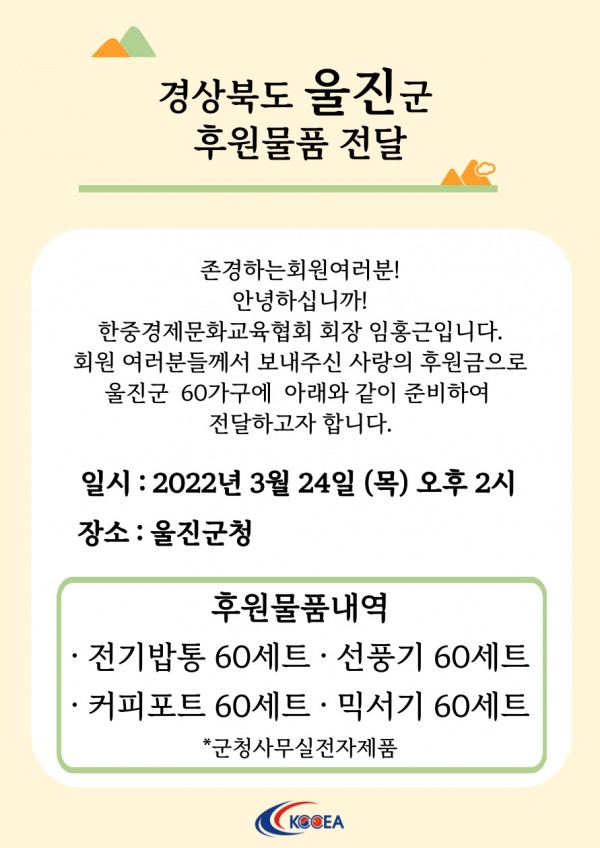 울진산불피해 후원물품전달 페이지 정보 작성자 최고관리자 작성일22-03-17 17:20 조회7,857회 댓글0건 관련링크 이전글 다음글 목록 본문 안녕하십니까!신경숙중국어학원 설립대표원장입니다.한중경제문화교육협회 회원님들과수강생들께서 보내주신 후원금으로아래와같이 울진군에 사랑의 물품전달식을 개최합니다. 일자:3월 24일시간:14시장소:울진군청 이전글 다음글 목록