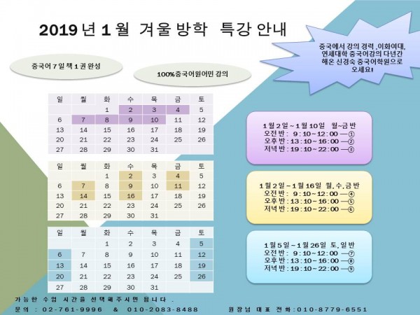 겨울방학 특강 안내 페이지 정보 작성자 최고관리자 작성일18-12-13 14:36 조회14,109회 댓글0건 관련링크 이전글 다음글 목록 본문 2018년 신경숙 중국어학원에서는 겨울방학특강을 아래와같이 개최합니다.월~금요반, 월수금반, 토,일반등 있으며 시간은 오전반은 9시10분부터 12시까지,오후반은 13시 10분부터 16시까지저녁반은 19시10분부터 22시까지 다양하므로 많은 선택을 바랍니다. 이전글 다음글 목록