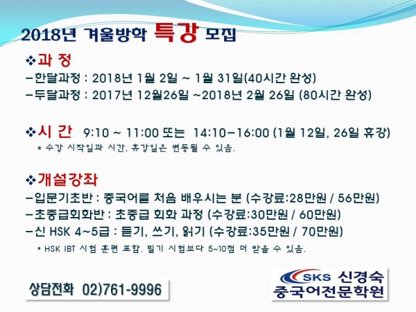 2018년 겨울방학특강 페이지 정보 작성자 최고관리자 작성일17-11-28 14:55 조회14,647회 댓글0건 관련링크 이전글 다음글 목록 본문 2018년 겨울방학특강 이전글 다음글 목록