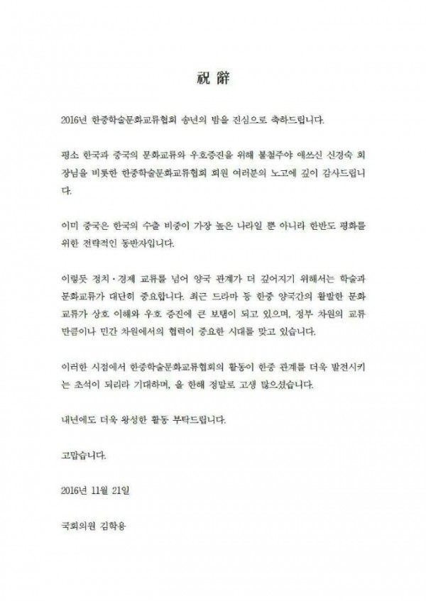 김학용 국회의원 축사(2016한중문화협회 송년의밤) 페이지 정보 작성자 최고관리자 작성일16-12-06 12:06 조회15,061회 댓글0건 관련링크 이전글 다음글 목록 본문 김학용 국회의원 축사(2016한중문화협회 송년의밤) 이전글 다음글 목록