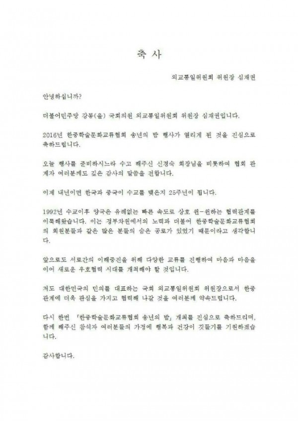 심재권 국회의원 축사 (2016한중문화협회 송년의밤) 페이지 정보 작성자 최고관리자 작성일16-12-06 12:10 조회15,017회 댓글0건 관련링크 이전글 다음글 목록 본문 심재권 국회의원 축사 (2016한중문화협회 송년의밤) 이전글 다음글 목록