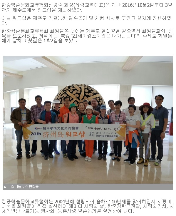 2016.10.17 한중학술문화교류협회 회장, 제주도 워크샵 개최 <나눔뉴스> 페이지 정보 작성자 최고관리자 작성일16-10-21 11:55 조회14,381회 댓글0건 관련링크 이전글 다음글 목록 본문 2016.10.17 한중학술문화교류협회 회장, 제주도 워크샵 개최 <나눔뉴스> 이전글 다음글 목록