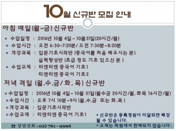 10월 신규반 모집 안내 페이지 정보 작성자 최고관리자 작성일16-09-23 14:08 조회19,297회 댓글0건 관련링크 이전글 다음글 목록 본문 10월 신규반 모집 안내 이전글 다음글 목록