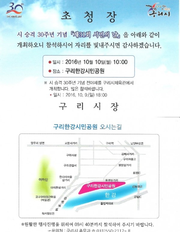 구리시승격30주년 기념행사 초청장 페이지 정보 작성자 최고관리자 작성일16-10-18 11:34 조회14,518회 댓글0건 관련링크 이전글 다음글 목록 본문 구리시승격30주년 기념행사 초청장 이전글 다음글 목록