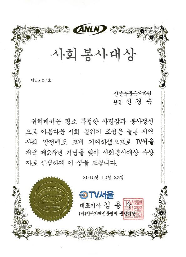 신경숙원장님 TV 서울 사회봉사대상 수상 페이지 정보 작성자 최고관리자 작성일15-10-26 11:35 조회14,365회 댓글0건 관련링크 이전글 다음글 목록 본문 사랑하는 수강생여러분들 안녕하세요~신경숙중국어학원입니다. 저희 신경숙원장님께서 TV 서울에서 수여하시는 사회봉사대상을 수상받으셨습니다. 신경숙원장님 사회봉사대상 수상을 축하드립니다~^^ 이전글 다음글 목록